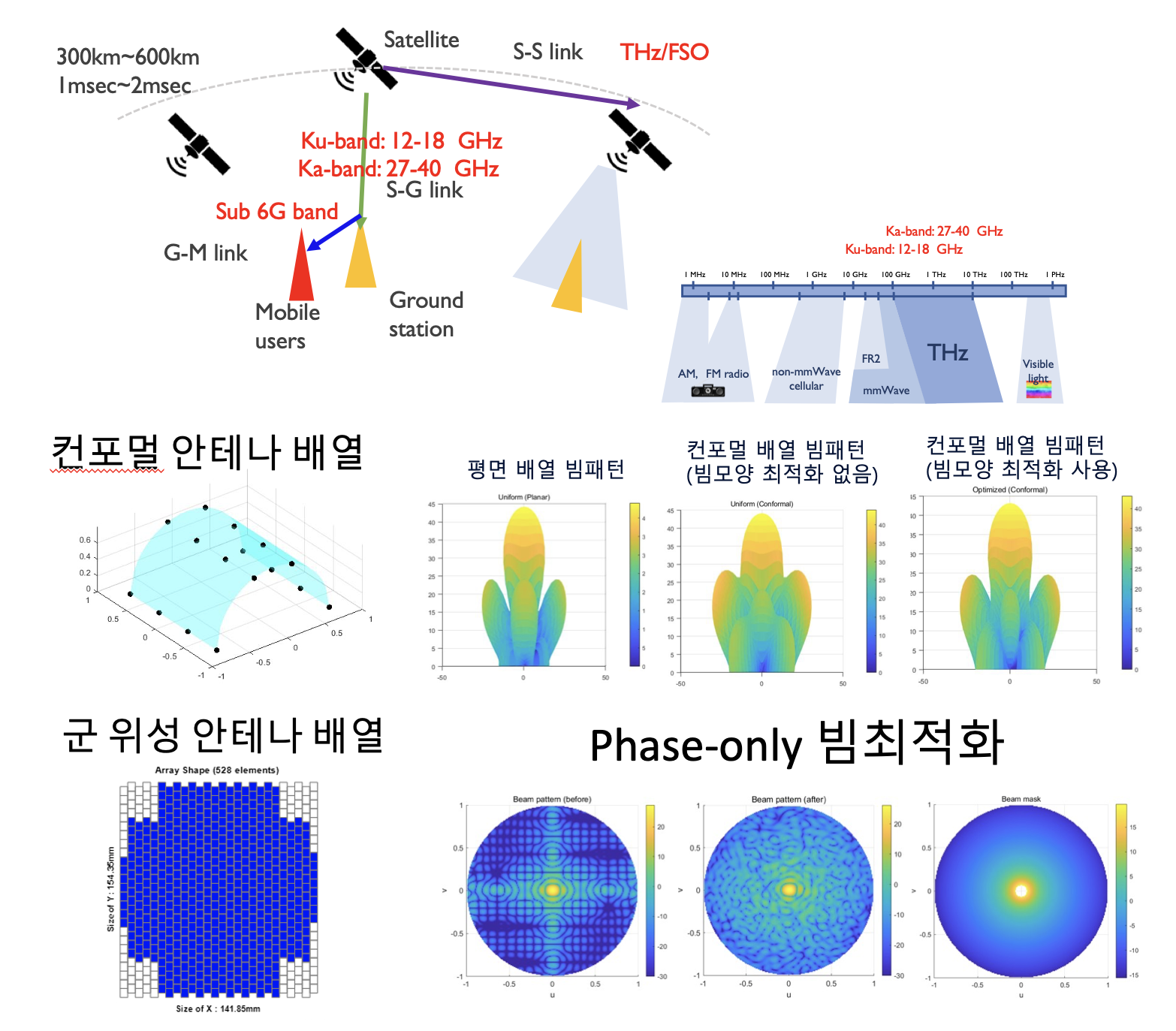 본 연구는 위성 통신 시스템의 효율성과 통신 품질 향상을 위한 첨단 빔포밍(Beamforming) 기술 개발에 중점을 둔다. 위성의 제한된 자원과 넓은 커버리지 요구사항을 고려하여, 컨포멀 배열 안테나 및 군 위성용 배열 안테나와 같은 다양한 안테나 구성에 대한 빔 최적화 기법을 연구한다. 이를 통해 정밀한 펜슬빔(Pencil Beam) 형성과 시공간 처리를 이용한 효과적인 간섭 제어 기술을 확보하며, 지상 단말과의 안정적인 통신 링크를 제공하고 주파수 사용 효율을 극대화하는 것을 목표로 한다.